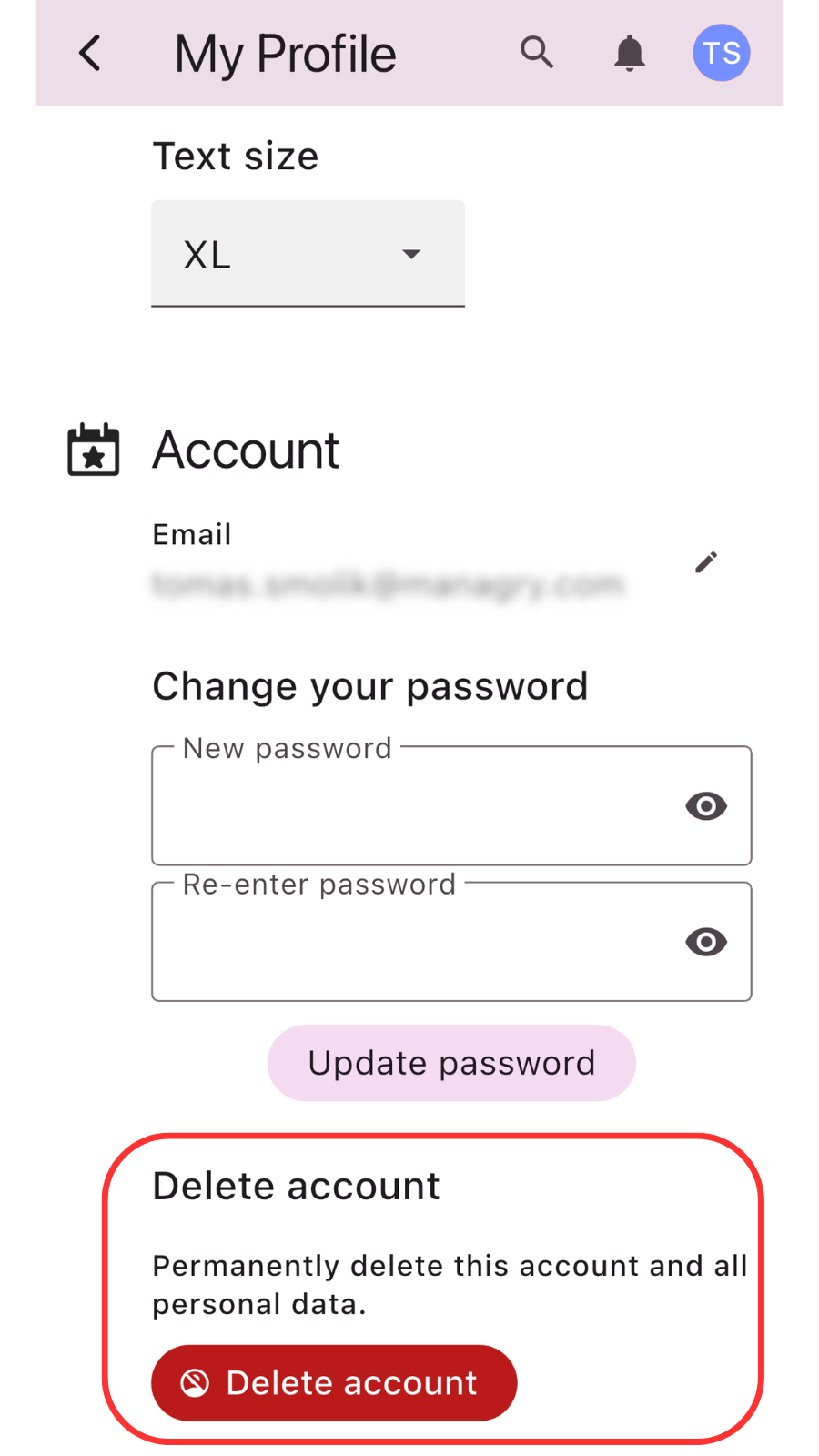 At the bottom of the screen you can find a "Delete account" button. Click on the button and confirm the deletion to remove your account and associated data.