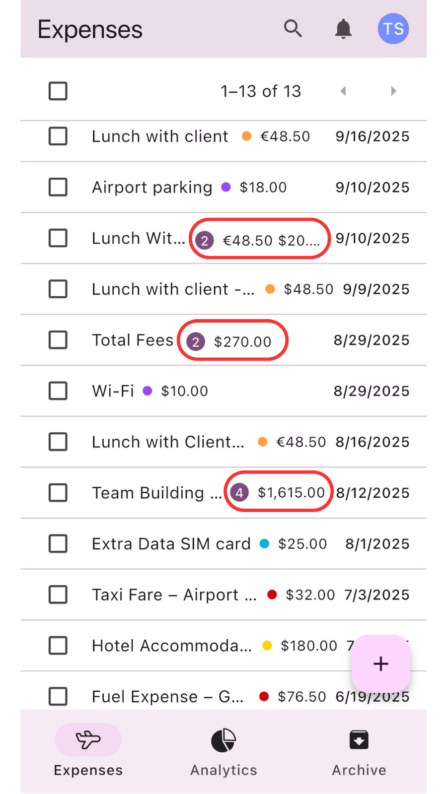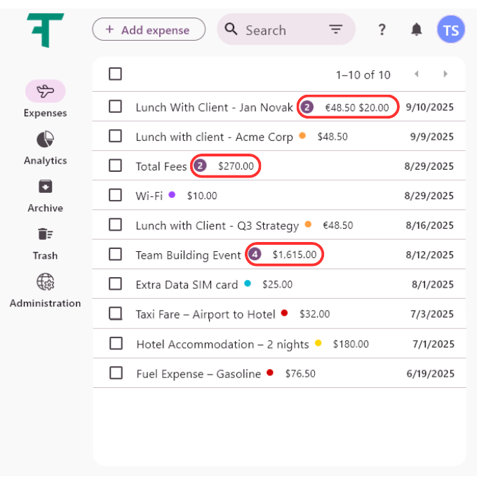 Number of expenses: A number in a circle next to the group name indicates how many individual expenses the group contains (e.g., Team Building Event (4)).