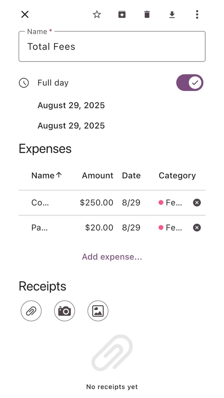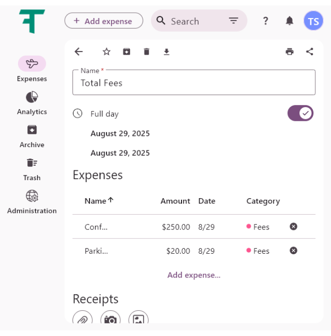 You can attach any number of receipts at once in the Receipts section. Supported methods include uploading files, taking a photo, or selecting from your gallery.