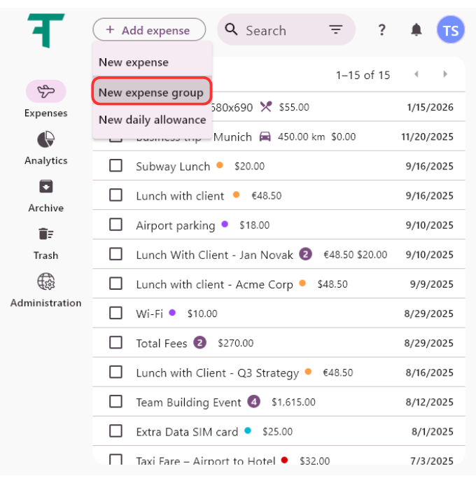 Expense groups allow you to group individual expenses under one common name. Instead of seeing ten separate expenses in your list, you will see one organized group, significantly simplifying approval and archiving processes.