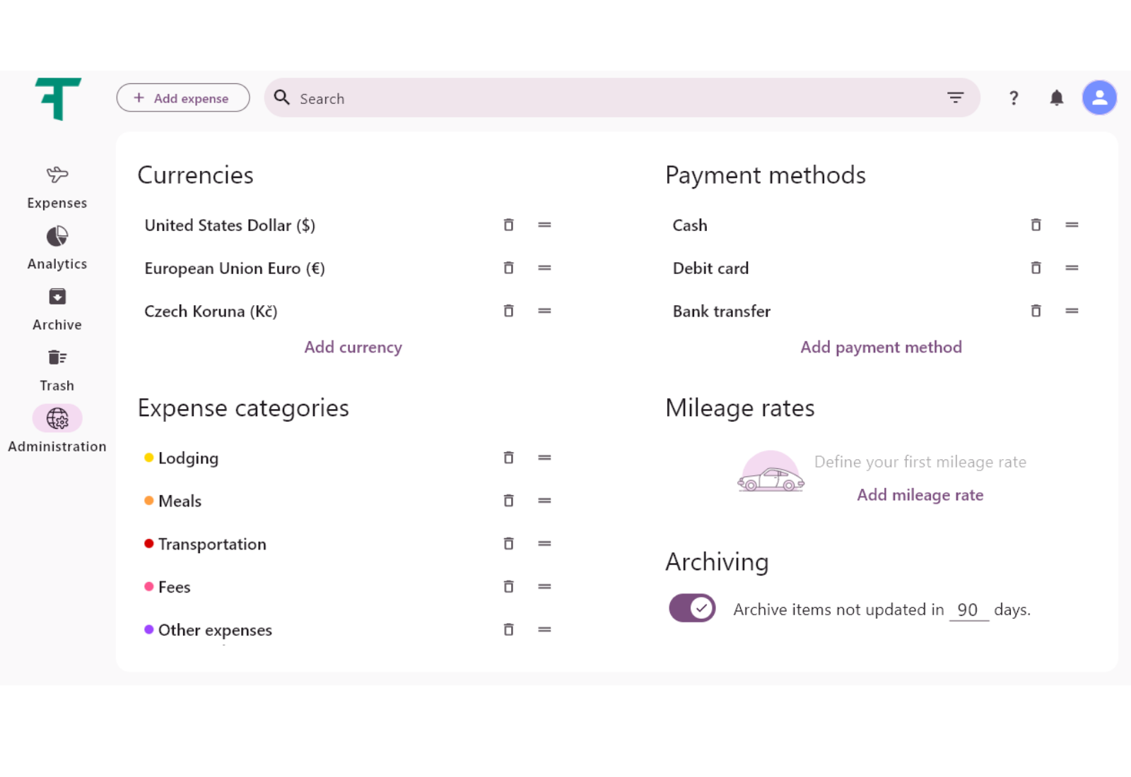 The "Administration" section allows you to specify your requirements for expense tracking better. Here, you can add currencies and payment methods and create expense categories.