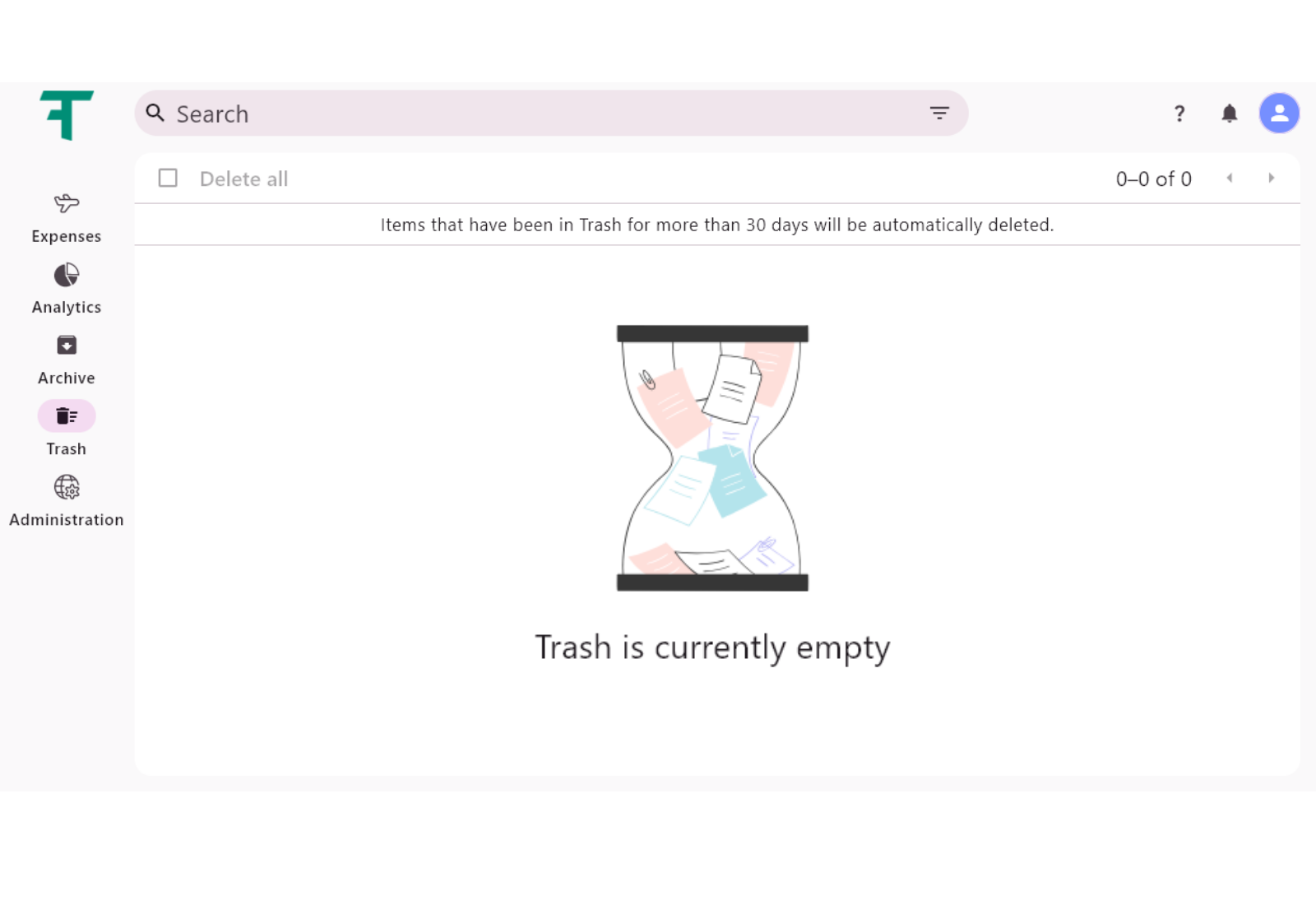 The "Trash" stores all the deleted expenses. You can retrieve them at any time up to 30 days, after which they will be permanently deleted.