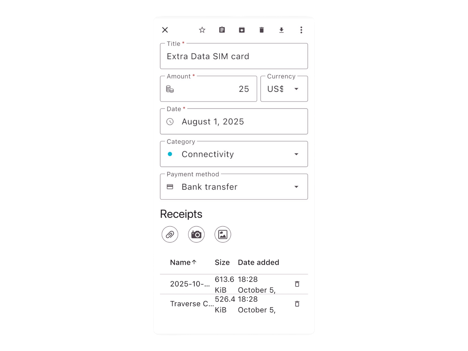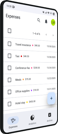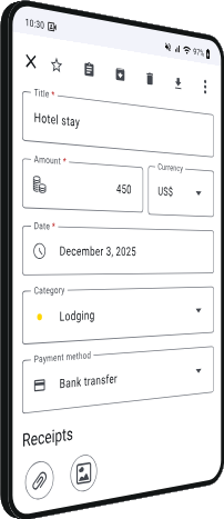 Bring order to your spending - organize your expenses into clear groups and categories for easier financial management. Keep everything structured and get instant insight into all your reports. Organize your business trip into one report for easy reimbursement.