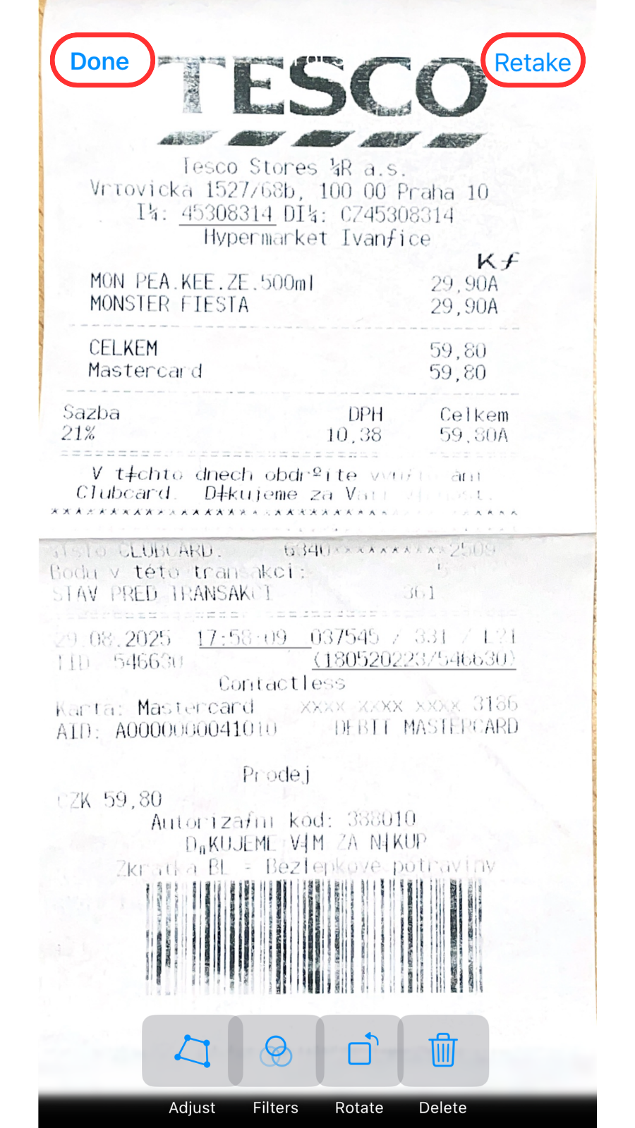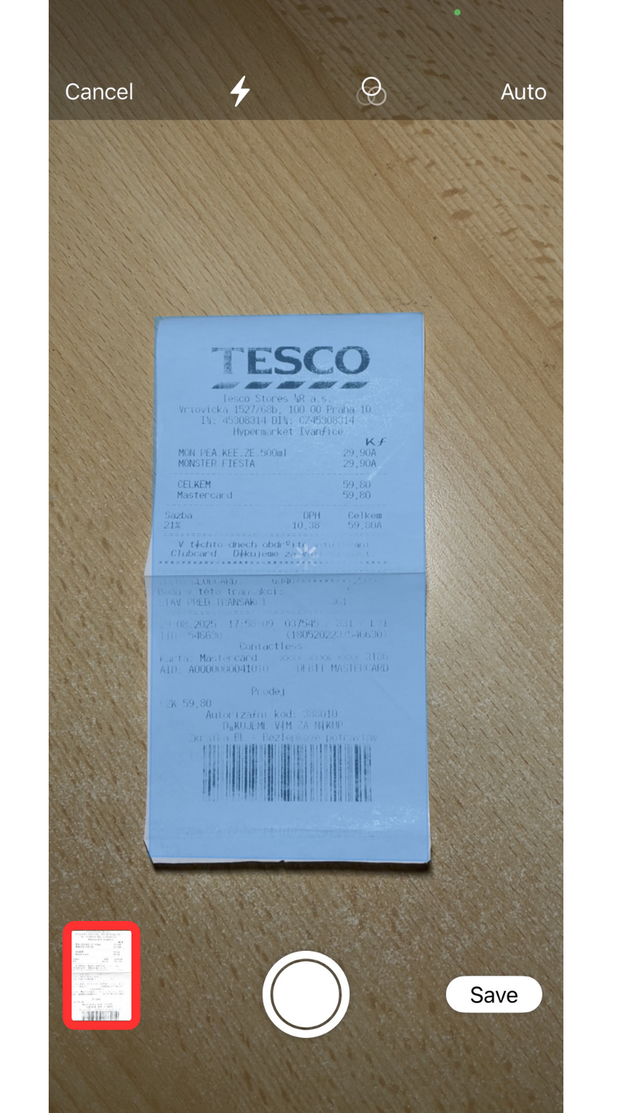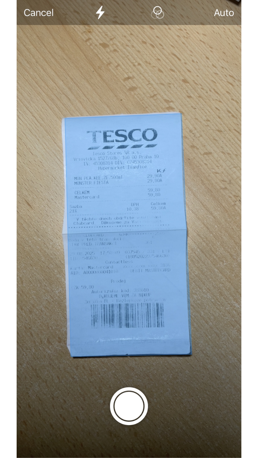 Smart Auto‑Capture: Namieste fotoaparát na účtenku. Aplikácia automaticky rozpozná okraje a urobí snímku bez toho, aby bolo potrebné stlačiť tlačidlo. Neprerušované skenovanie: Pokiaľ držíte kameru nad ďalšou účtenkou, systém bude pokračovať vo vytváraní a ukladaní nových skenov. Ideálne na spracovanie celej sady účteniek z pracovnej cesty.