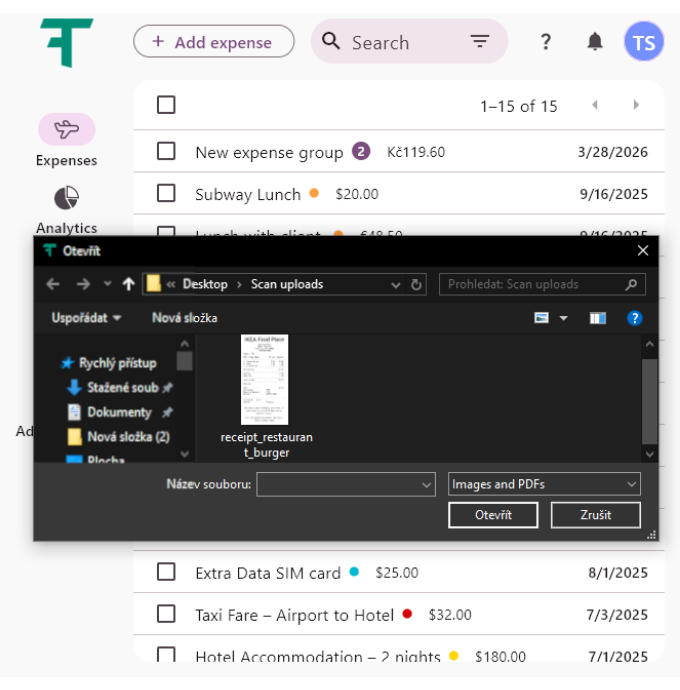 Ak ste naskenovali viac účteniek, systém ich automaticky zoskupí do novej skupiny výdavkov. Tým zostane váš prehľad čistý a súvisiace náklady (napr. viacdňová pracovná cesta) budú prepojené od začiatku.