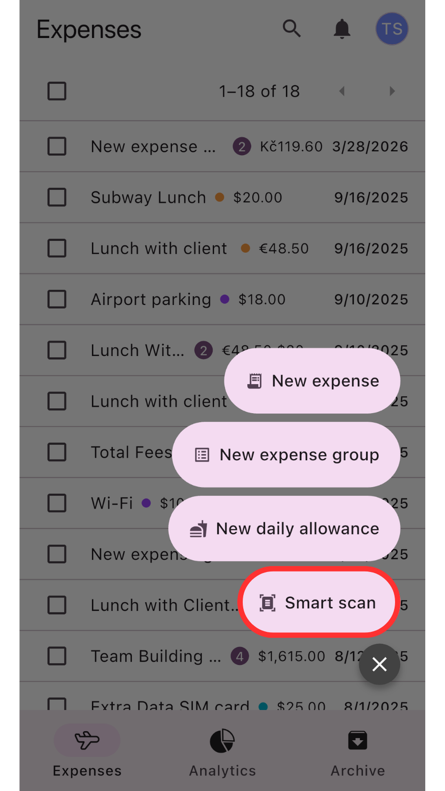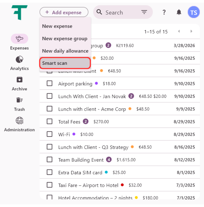 Smart scan využíva pokročilé optické rozpoznávanie znakov (OCR), ktoré odstraňuje potrebu ručného zadávania údajov. Po odfotení alebo nahraní účtenky systém automaticky extrahuje kľúčové informácie, ako sú suma, dátum a názov obchodníka, čo vám umožní vytvoriť presný záznam v priebehu niekoľkých sekúnd.